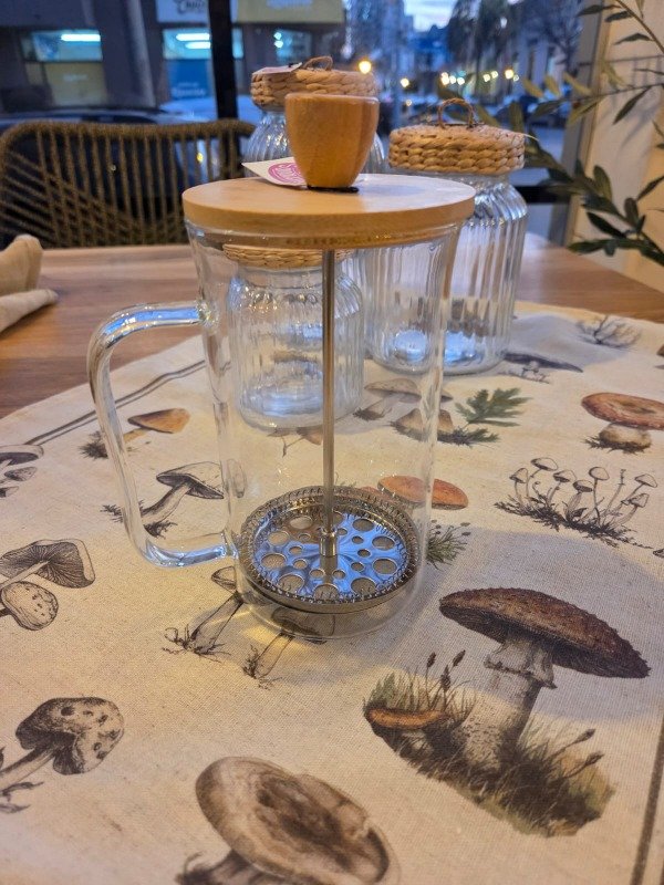 Dispositivo para preparar café , de vidrio con prensa y tapa de bambú