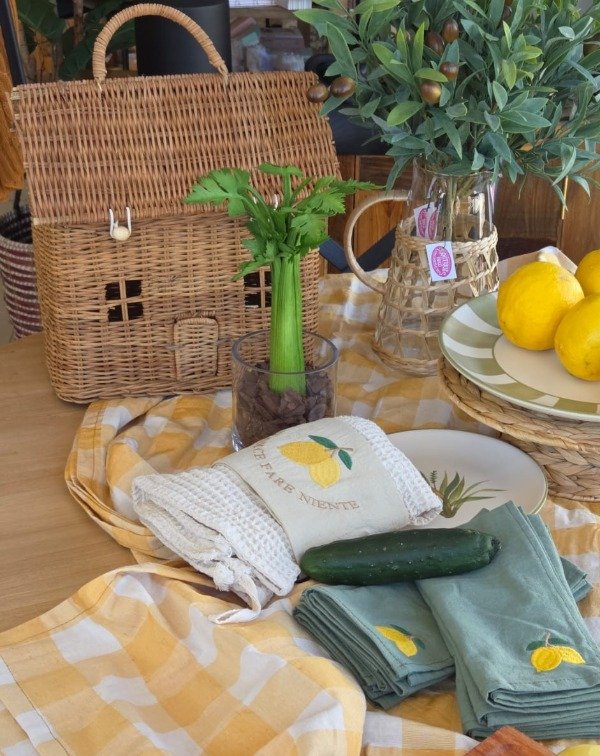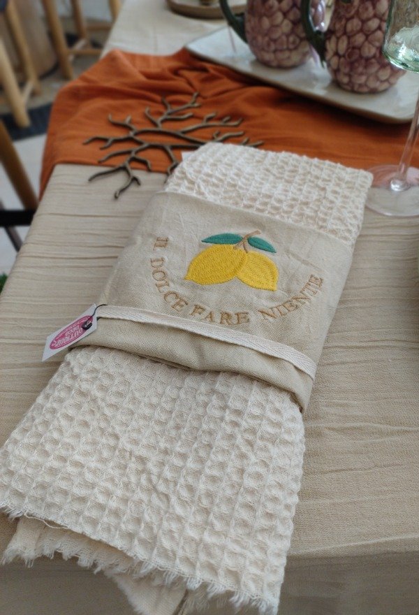 Paño de cocina, uno de tusor bordado limón, y wafle