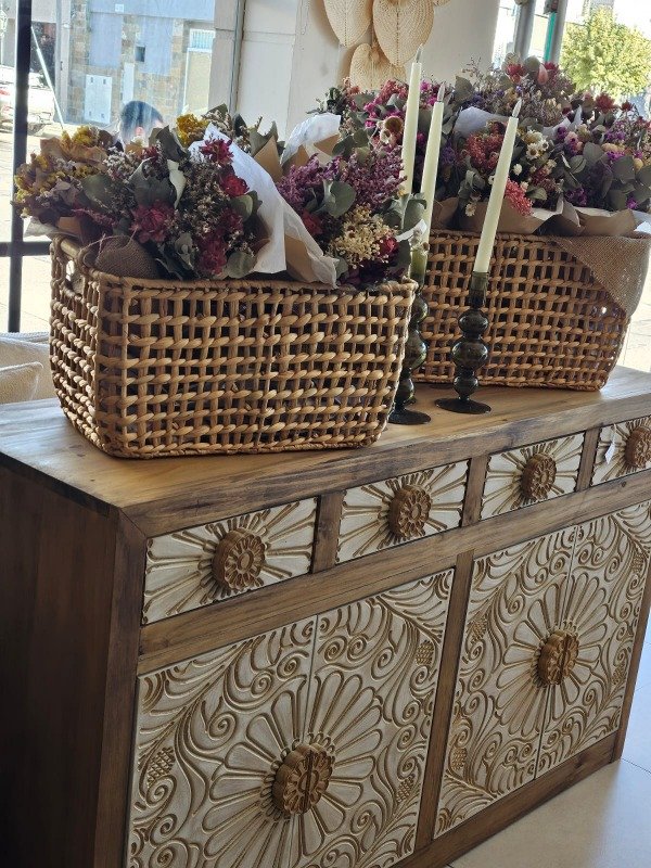 Mueble calado de madera con dos espacios de guardado y cuatro cajones
